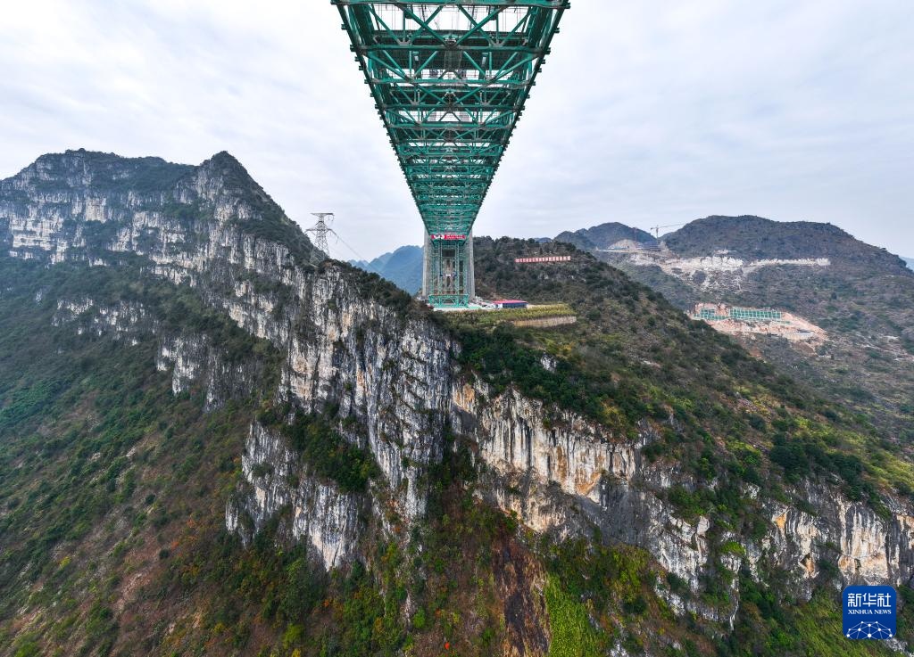 1月14日拍摄的贵州六安高速公路花江峡谷大桥施工现场(无人机照片)。