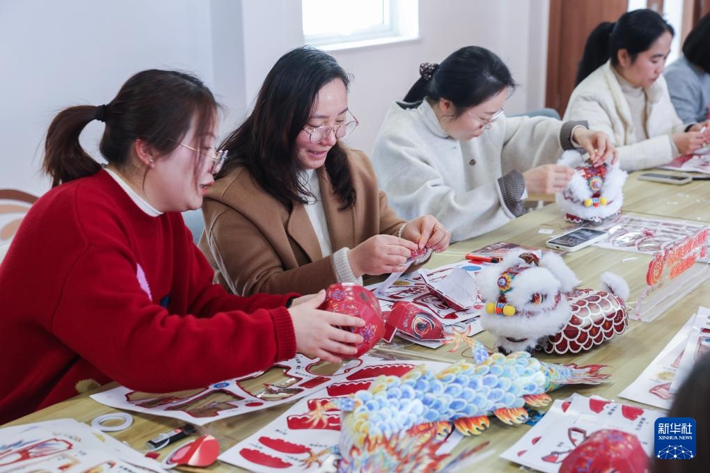 1月14日,在浙江省嘉兴市南湖区建设街道子城社区民族之家内,居民在制作醒狮灯笼。