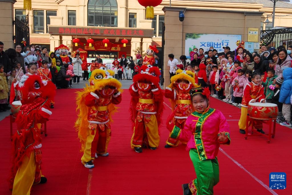 1月13日,在山东省青岛市即墨区皋虞路幼儿园举行的“赶年货大集 品童趣年味”活动中,孩子们舞狮迎新春。