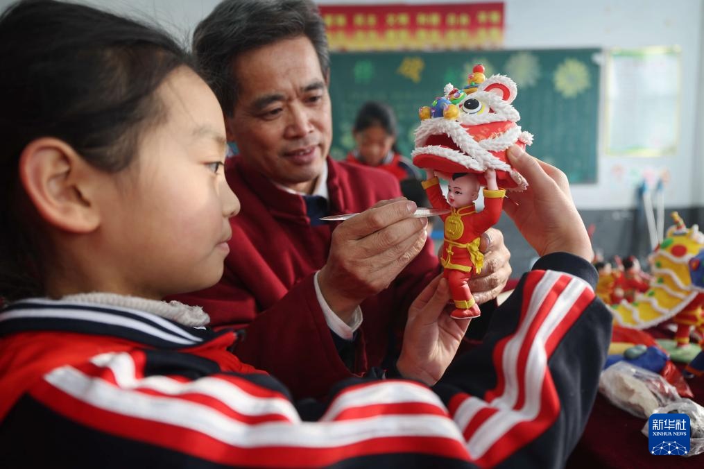 1月14日,在山东省临沂市沂南县铜井镇鲁家庄中心小学开展的“巧手面塑迎新年”活动中,一名小学生在面塑技艺传承人左安胜的指导下对面塑作品精雕细琢。