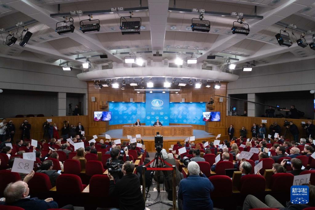 1月14日,在俄罗斯首都莫斯科,媒体记者举手提问。