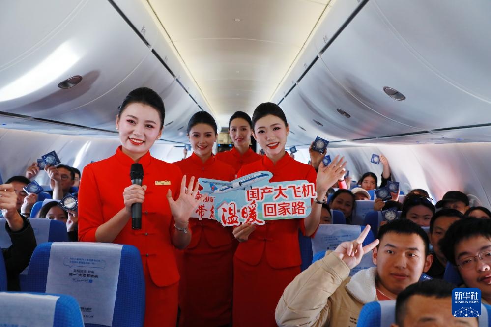 1月14日,在南航CZ8233广州—成都天府航班上,空乘人员开展C919国产大飞机投入春运主题活动。