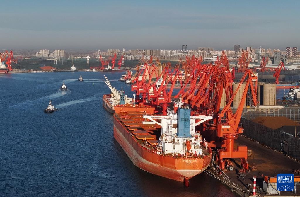 1月15日,一艘轮船靠泊在唐山港京唐港区散货码头卸货(无人机照片)。