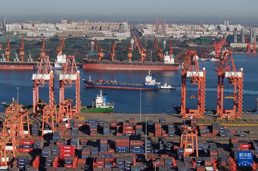1月15日,一艘轮船在唐山港京唐港区集装箱码头卸载后驶离(无人机照片)。