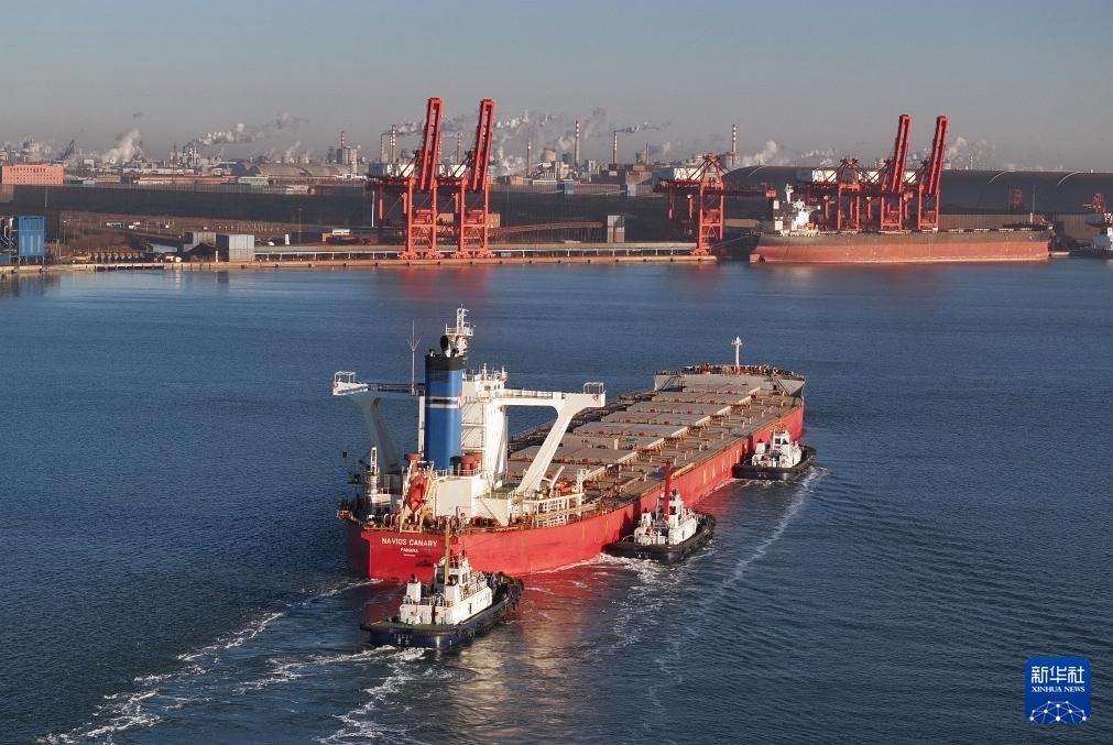 1月15日,一艘轮船在拖轮协助下向唐山港京唐港区散货码头靠泊(无人机照片)。