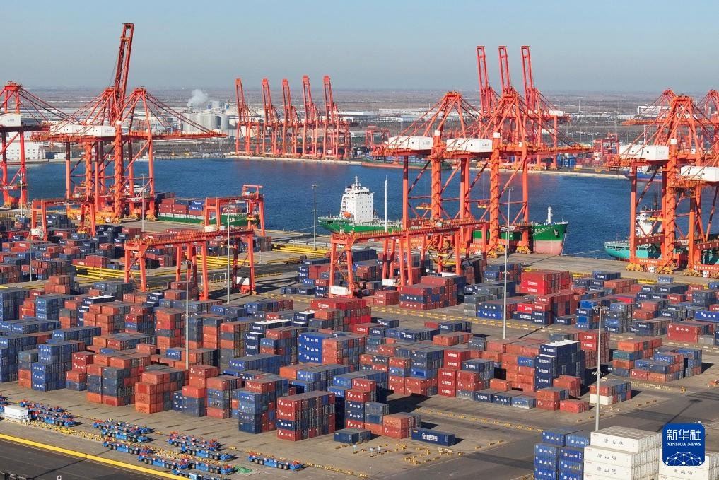 1月15日拍摄的唐山港京唐港区集装箱码头堆场(无人机照片)。