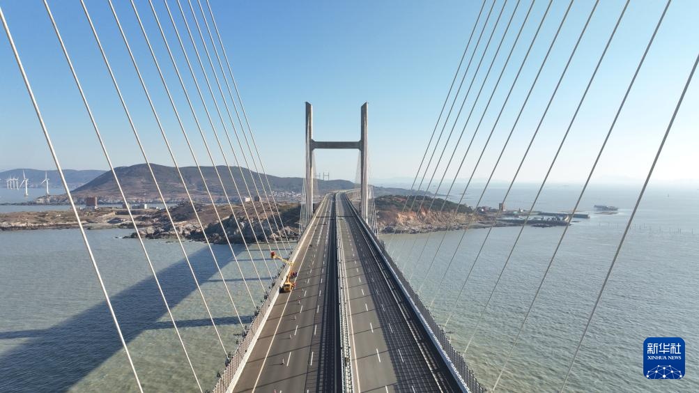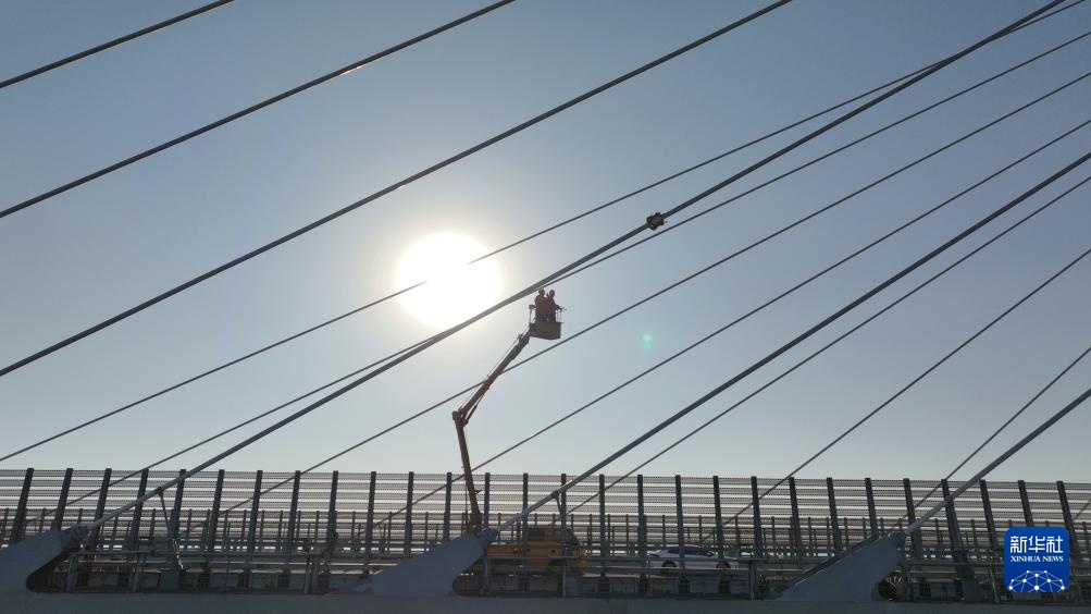 1月15日,福州工务段工人检修平潭海峡公铁大桥桥梁斜拉索(无人机照片)。