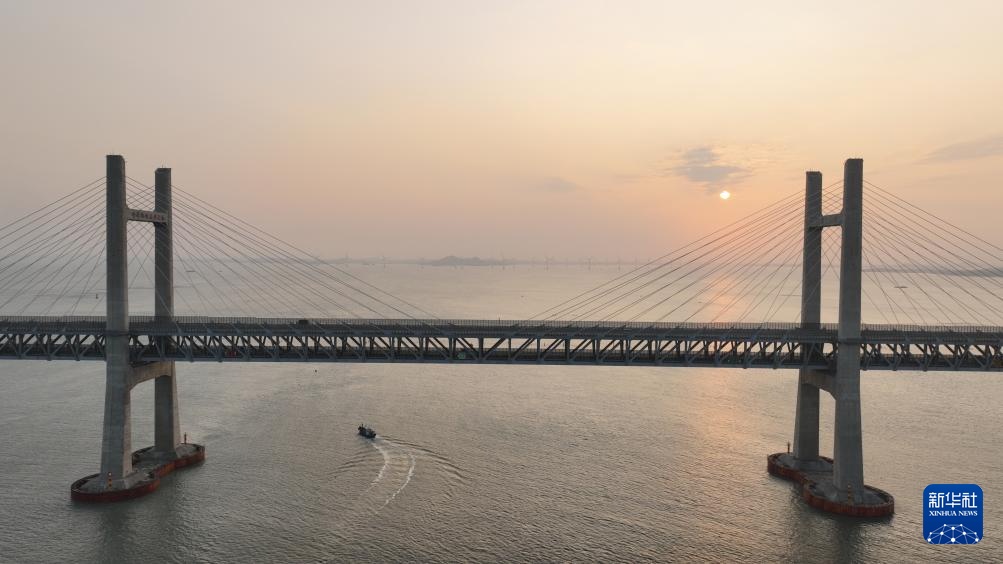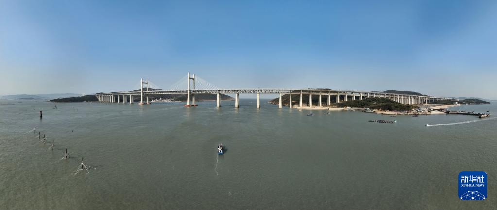 1月15日,福州工务段工人乘船出海对平潭海峡公铁大桥巡检(无人机全景拼接照片)。