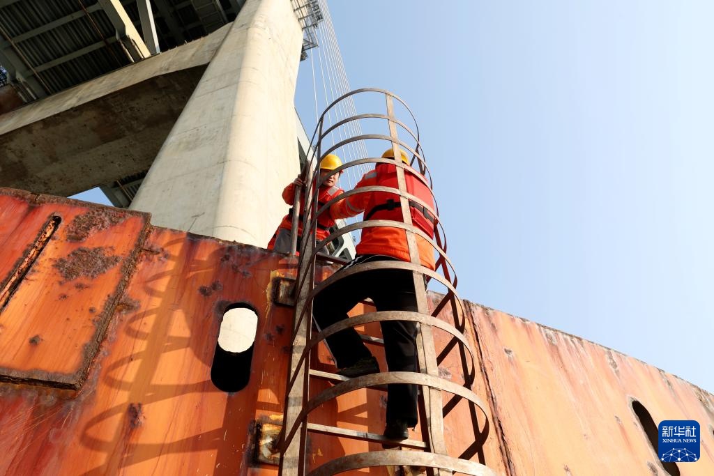 1月15日,福州工务段工人爬上平潭海峡公铁大桥海面承台。