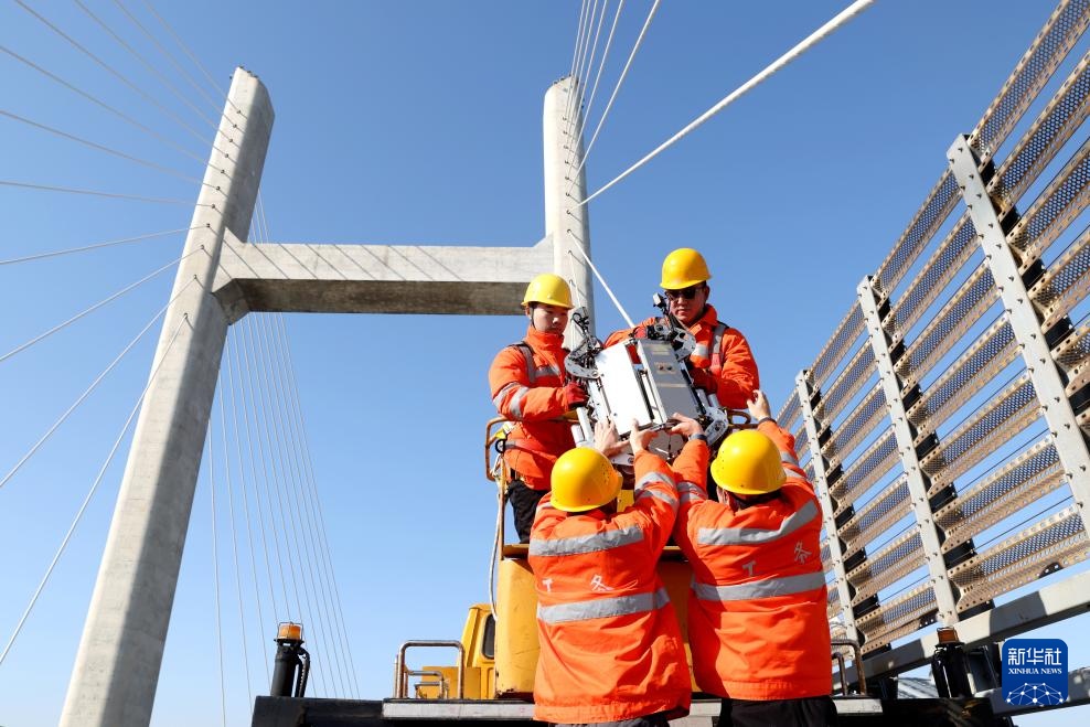 春运期间,福州工务段的铁路工人在福建平潭海峡公铁大桥进行维护工作,确保大桥设备安全,保障旅客春运路途平安。