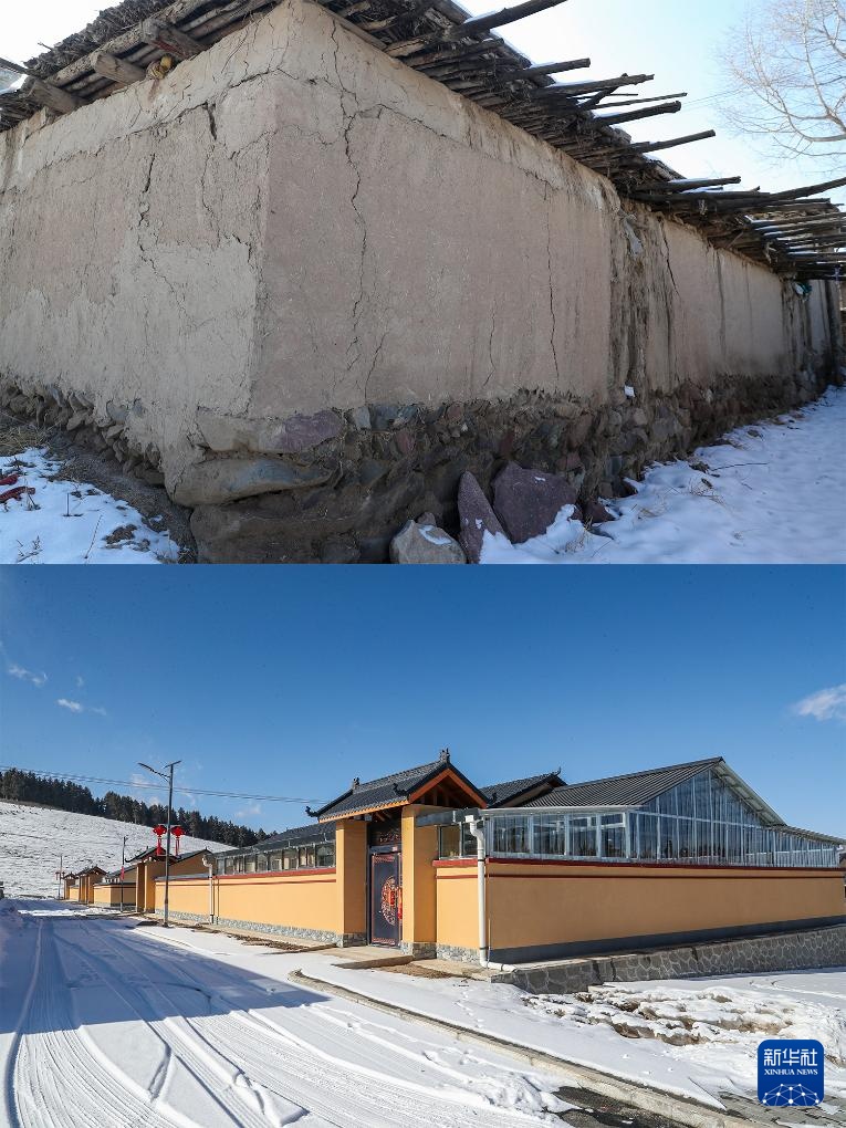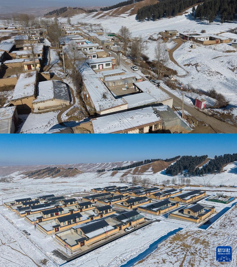 拼版照片:这是1月15日拍摄的天祝藏族自治县哈溪镇水泉村一处农家院落(上);这是1月15日拍摄的水泉村生态及地质灾害避险搬迁安置点新房(下,无人机照片)。