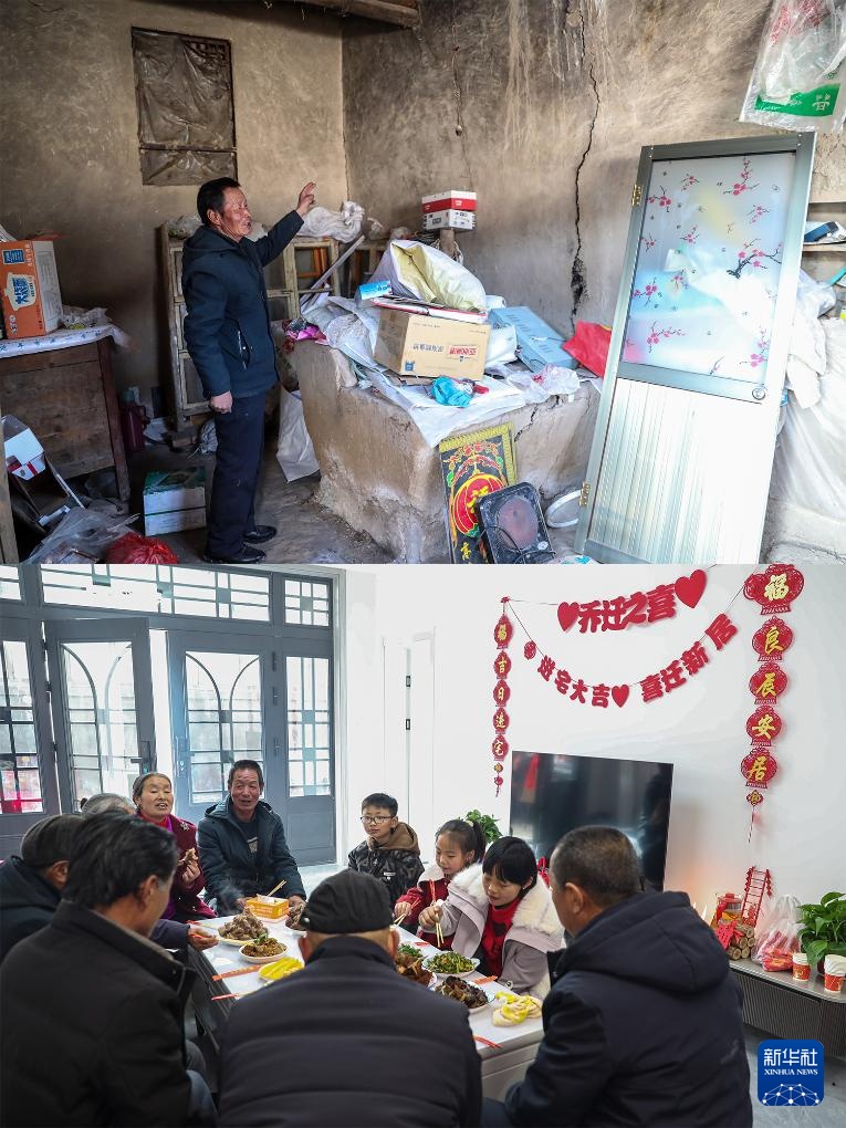 拼版照片:1月15日,在天祝藏族自治县哈溪镇水泉村,村民魏朝录介绍搬迁前老房子受洪涝灾害影响墙体开裂的情况(上);1月15日,在水泉村生态及地质灾害避险搬迁安置点,当日搬进新家的魏朝录和亲朋好友共享乔迁宴(下)。