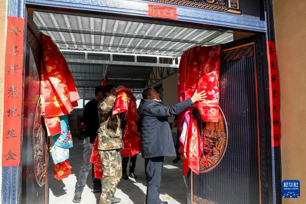 1月15日,在天祝藏族自治县哈溪镇水泉村生态及地质灾害避险搬迁安置点,村民将红色被面挂在新搬迁户的大门上表达祝福。