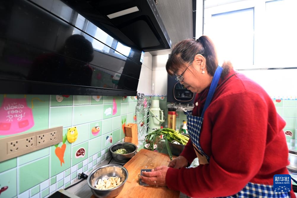 1月15日,在古浪县大靖镇三台村生态及地质灾害避险搬迁安置点,新搬迁入住的吴明月在厨房中做饭。