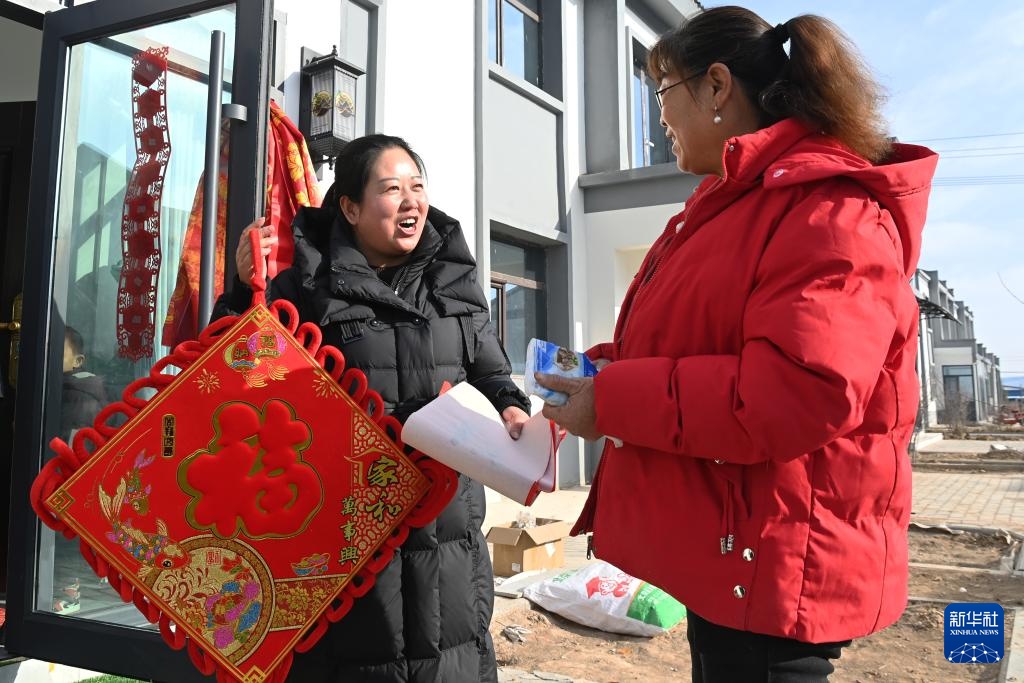1月15日,在古浪县大靖镇三台村生态及地质灾害避险搬迁安置点,三台村党支部书记兼村委会主任李光霞(左)给新搬迁入住的吴明月送上福字和春联。