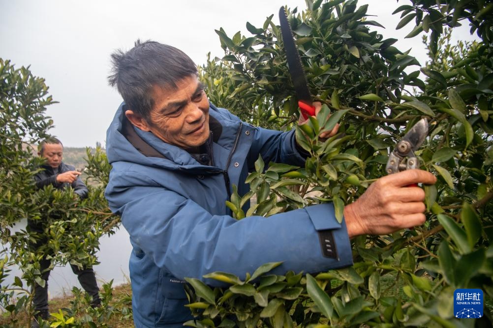 1月15日,在重庆市秀山土家族苗族自治县的柑橘种植基地,果农为脐橙树修枝。