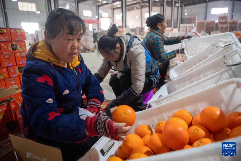 1月15日,在秀山县西部陆海新通道武陵山(秀山)柑橘出口交易中心,果农将脐橙打包装箱。