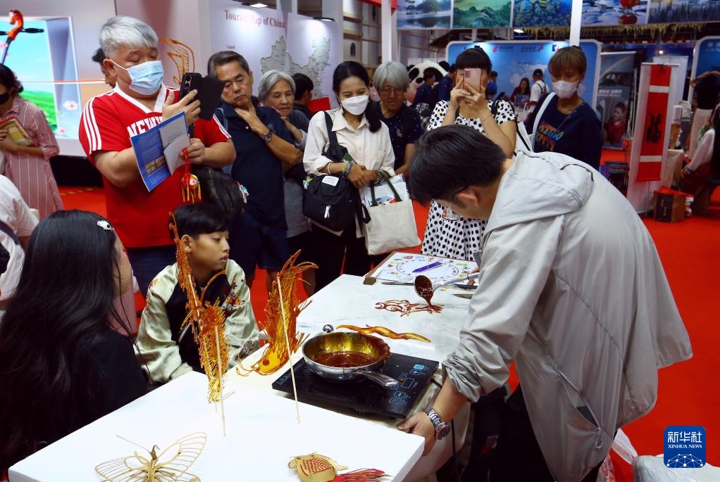 1月16日,人们在泰国曼谷举办的泰国国际旅游展上观看中国手工艺者表演制作糖画。