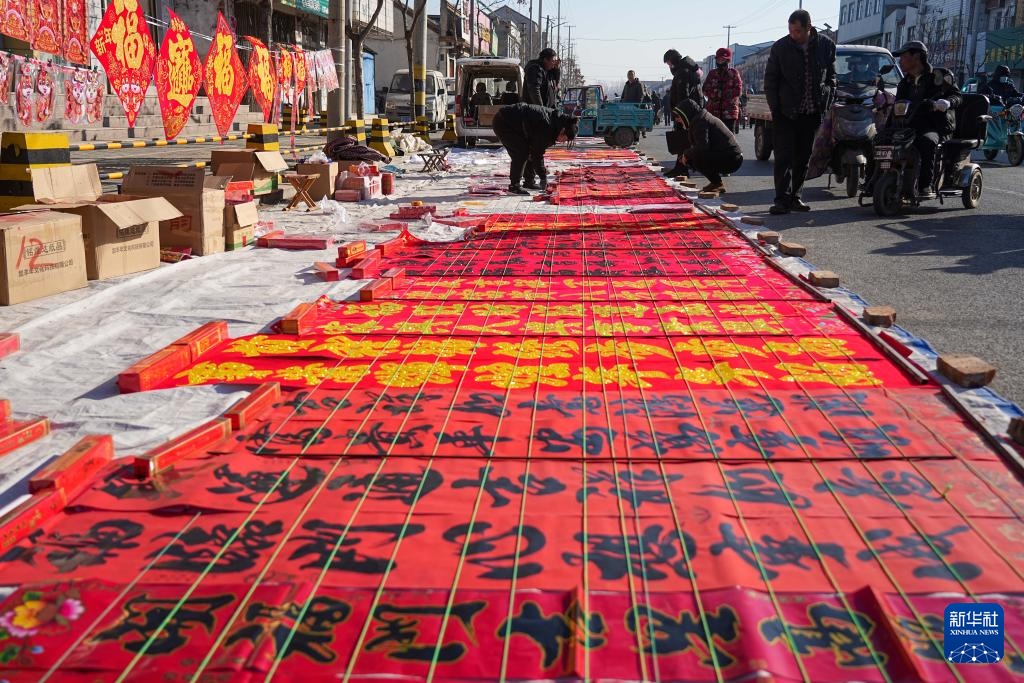 1月17日,人们在寨里镇大集上购买春联。