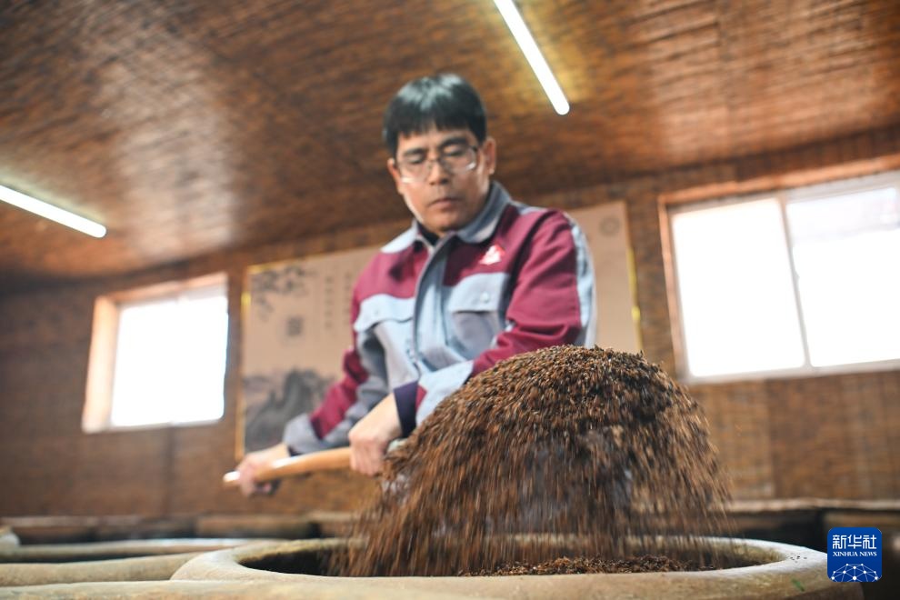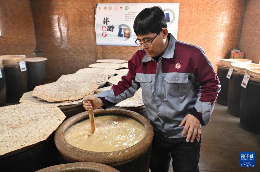 1月17日,制醋工人在天津市静海区天立独流老醋股份有限公司传统工艺发酵车间搅拌醪液进行酒精发酵。