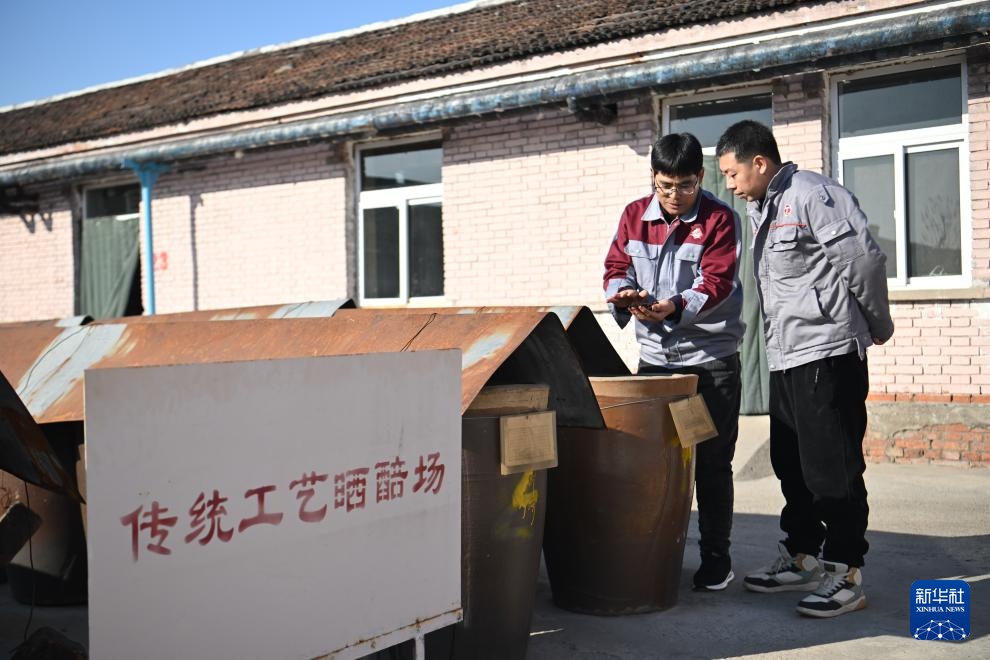 1月17日,制醋工人在天津市静海区天立独流老醋股份有限公司传统工艺晒醅场查看醋醅发酵程度。