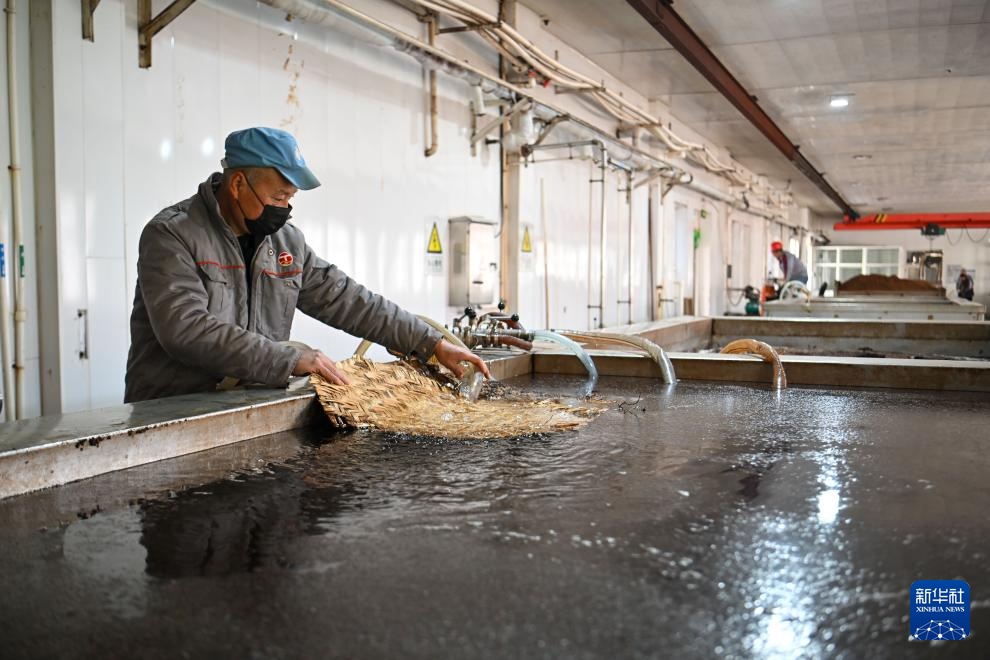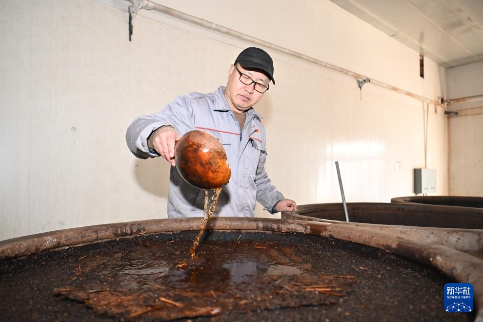1月17日,在天津市静海区天立独流老醋股份有限公司传统工艺淋醋车间,工人在醋醅上淋醋。