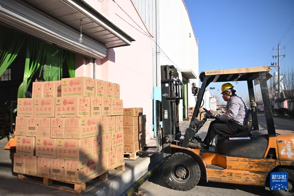 1月17日,在天津市静海区天立独流老醋股份有限公司,工人准备转运包装好的天立独流老醋产品。