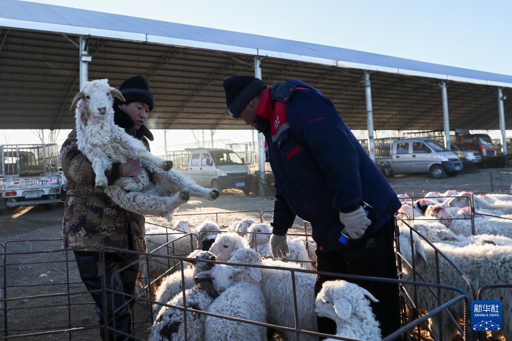 1月16日,在古浪县一处肉羊交易市场,农户与商贩交易羔羊。