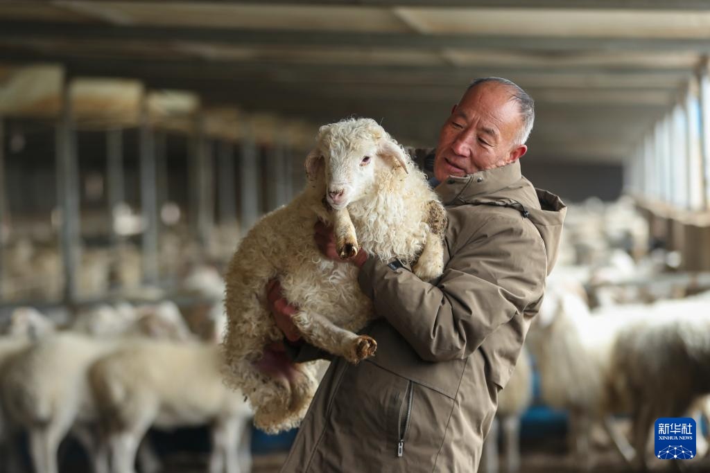 1月17日,在古浪县黄花滩干城乡富民新村,荣海农牧专业合作社负责人在展示小羊羔。