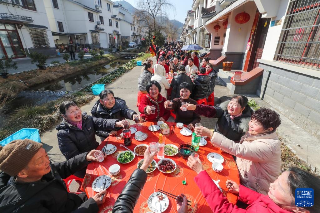 当日,浙江省建德市莲花镇戴家村“百家宴”过大年系列活动拉开帷幕。村民们共同品尝“百家宴”,拍摄“全村福”,还聚在一起看演出“我们的村晚”,热热闹闹迎新春。