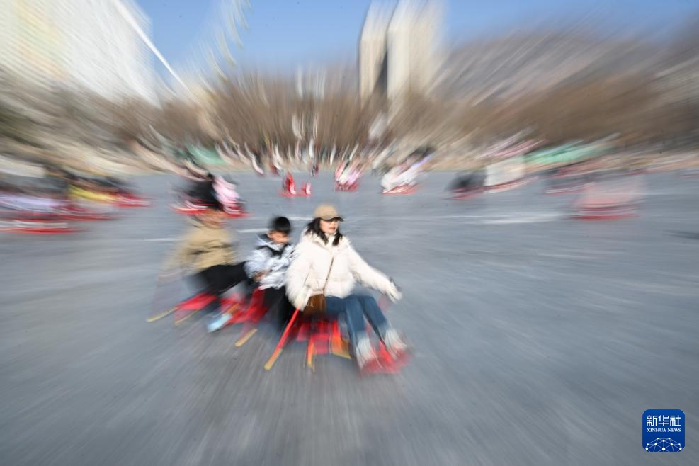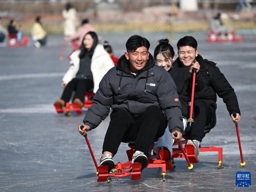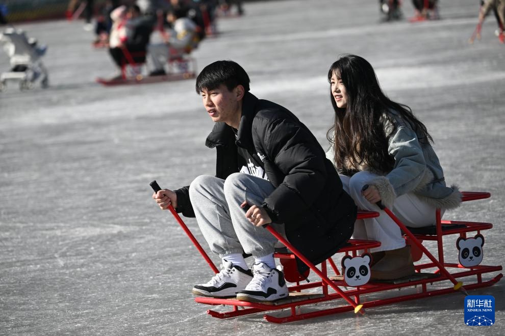 1月18日,市民在西宁市人民公园的冰场滑冰游玩。