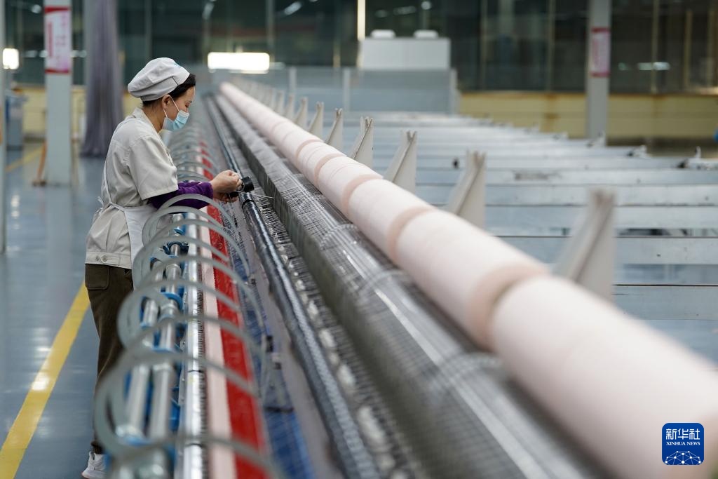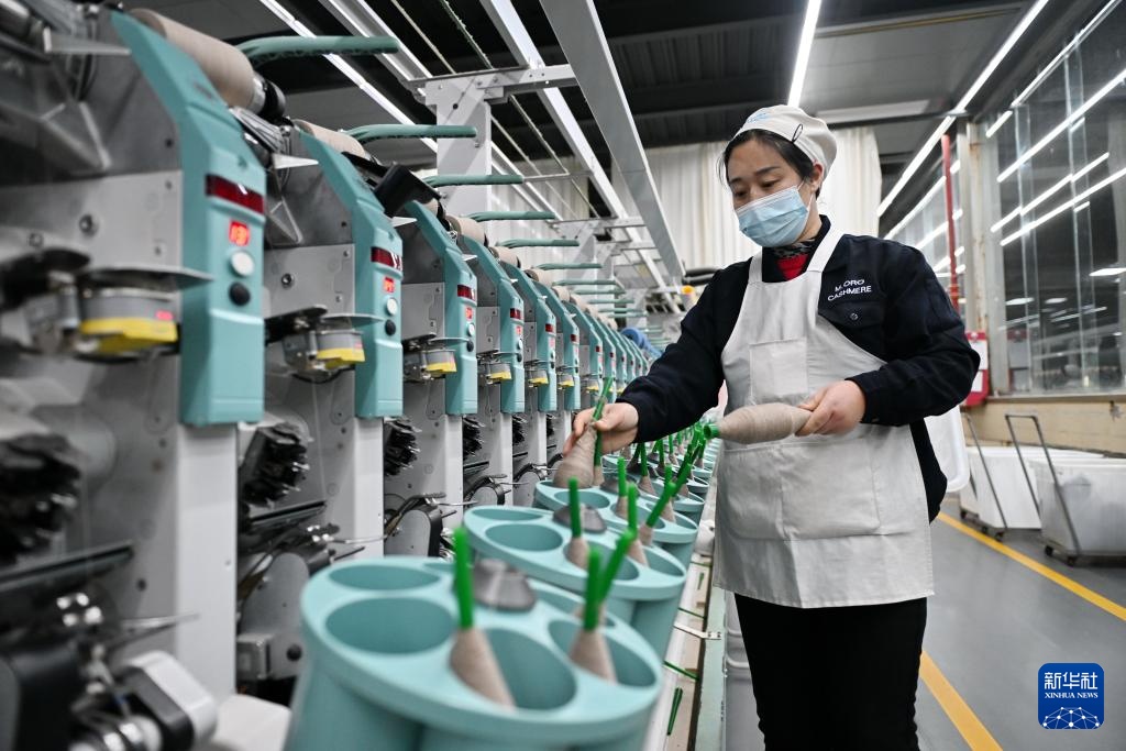 1月18日,河北省邢台市清河县一家羊绒制品生产企业的员工在羊绒纱线生产车间内工作。