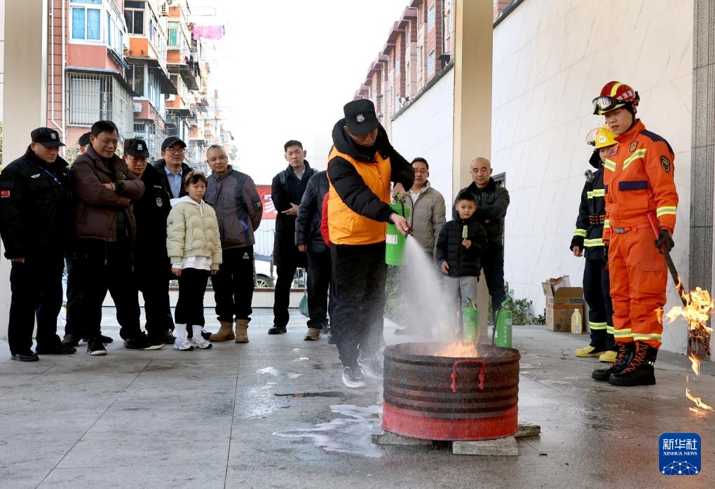1月19日,一位社区保安在活动现场体验使用灭火器。