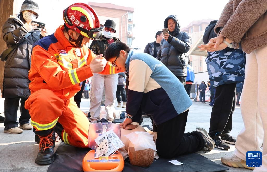 1月19日,一位消防员在指导社区居民进行心肺复苏训练。