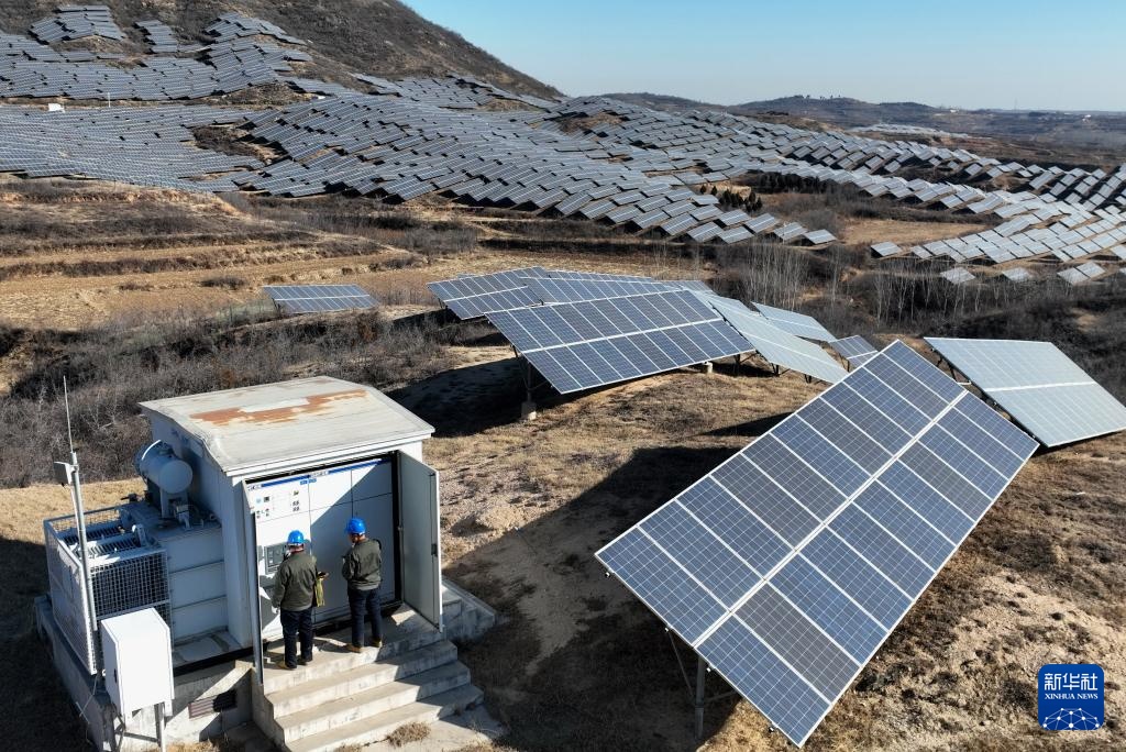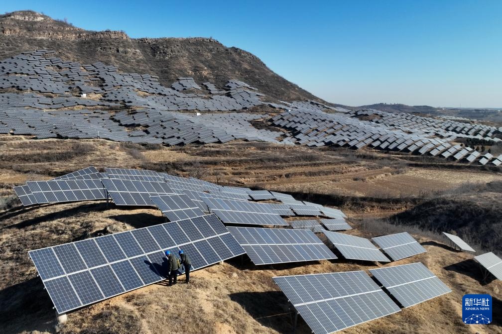 1月19日,国网邢台供电公司的工人在辖区虎头山光伏发电场巡检(无人机照片)。