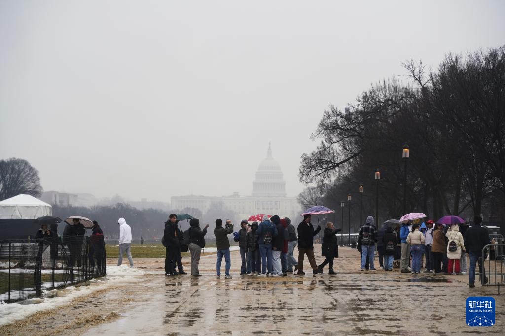 1月19日,在美国华盛顿,行人冒着雨雪行走。