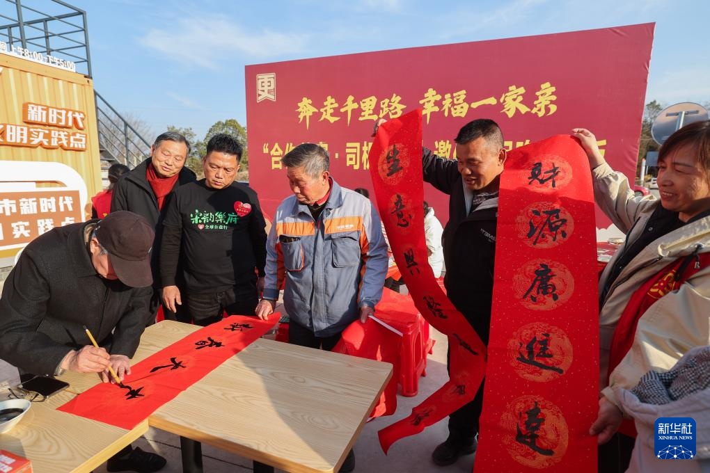 1月20日,在建德市更楼街道司机之家爱心驿站,书法爱好者为货车司机书写春联和福字。