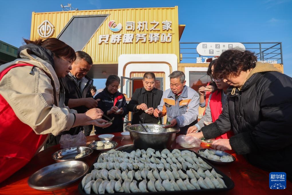 1月20日,在建德市更楼街道司机之家爱心驿站,货车司机和志愿者一起包饺子。