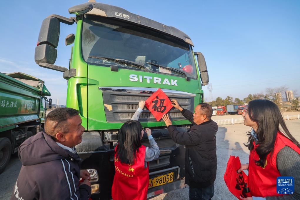 1月20日,在建德市更楼街道司机之家爱心驿站,货车司机和志愿者把福字贴到车头。