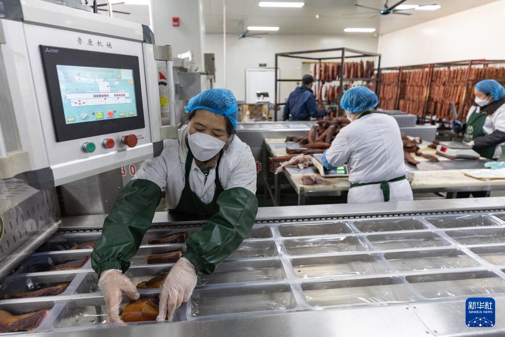 1月20日,在重庆市城口县坪坝镇新华村重庆美缀美食品有限公司,工人在外包装车间利用自动打包机封装腊肉。