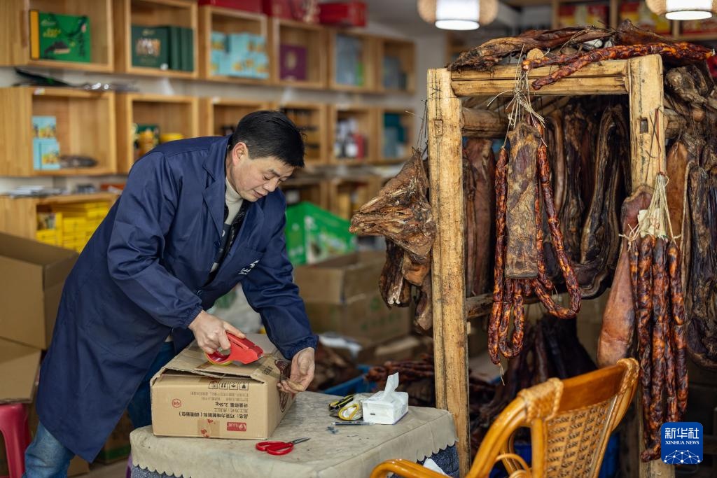1月20日,在重庆市城口县巴山物语电商超市,工作人员在打包消费者购买的腊肉产品。