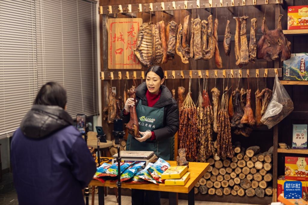 1月20日,在重庆市城口县巴山物语电商超市,主播向直播间的观众展示推销城口腊肉。