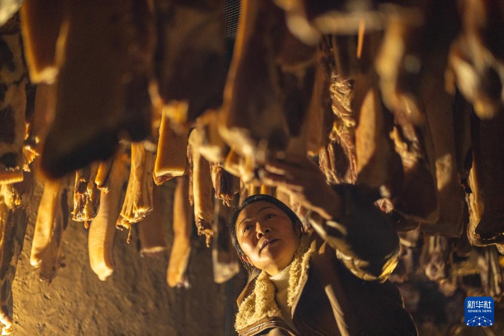1月19日,在重庆市城口县厚坪乡红色村,村民何宜香在查看腊肉产品的熏制情况。