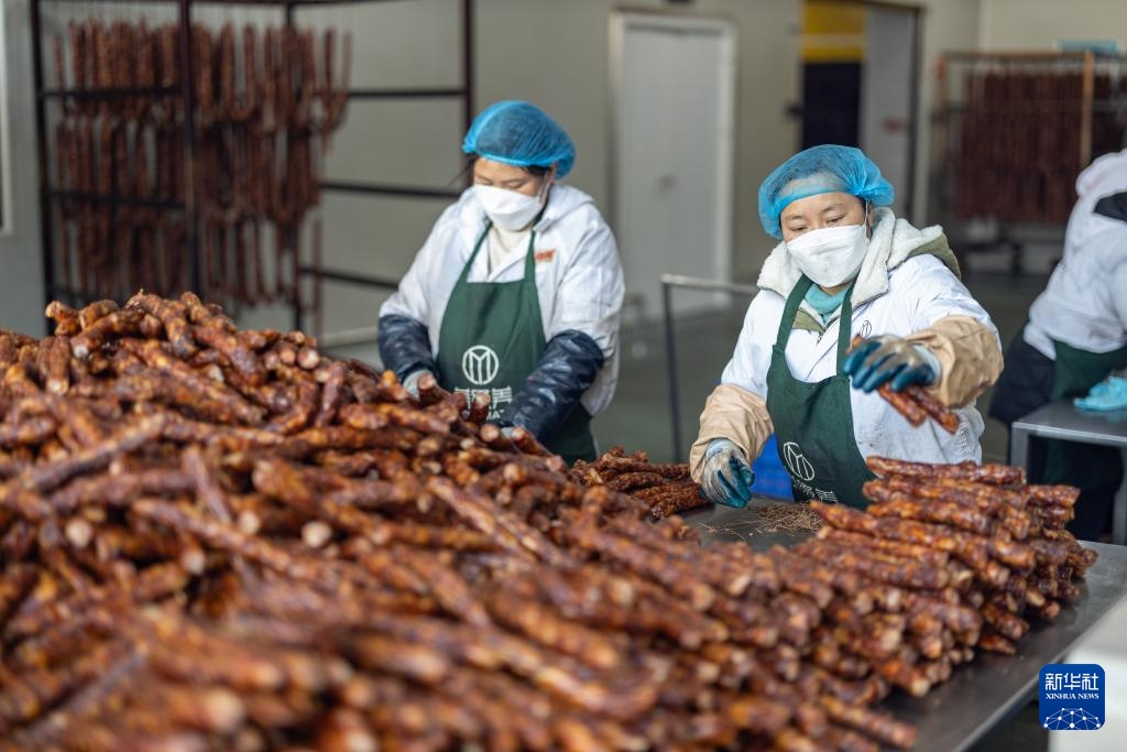 1月20日,在重庆市城口县坪坝镇新华村重庆美缀美食品有限公司,工人在整理香肠。