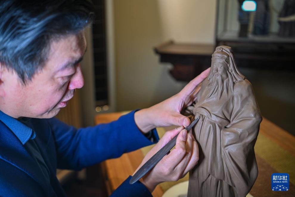 泥人张第六代传承人张宇在天津古文化街泥人张美术馆为新作品《福星》塑形(1月20日摄)。