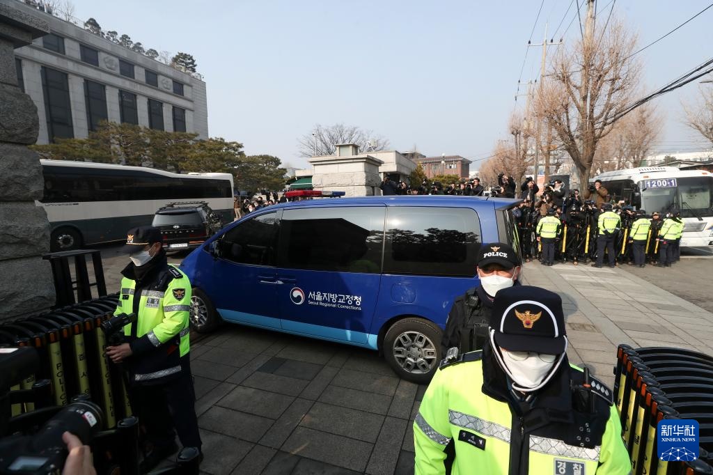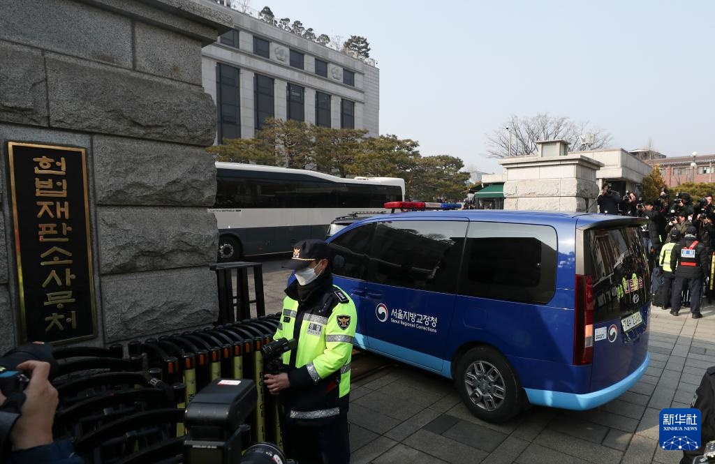 韩国被拘留总统尹锡悦当地时间21日13时许乘坐法务部车辆赴宪法法院,出席定于当天14时举行的总统弹劾案第三次正式辩论。