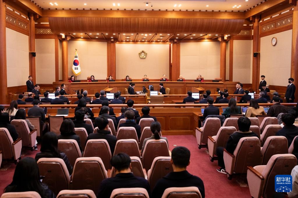 这是1月21日在韩国首尔宪法法院拍摄的庭审现场。