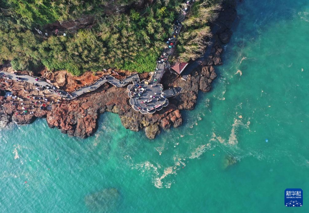 游客在广西涠洲岛的南湾鳄鱼山景区游玩(1月19日摄,无人机照片)。