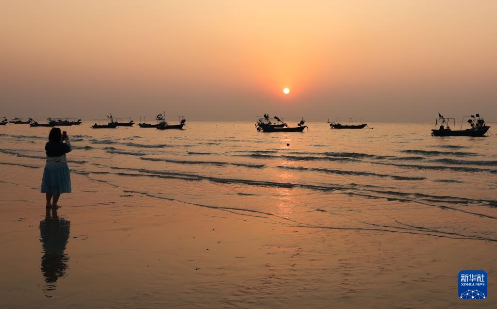 游客在广西涠洲岛的石螺口海滩拍摄落日风光(1月5日摄)。