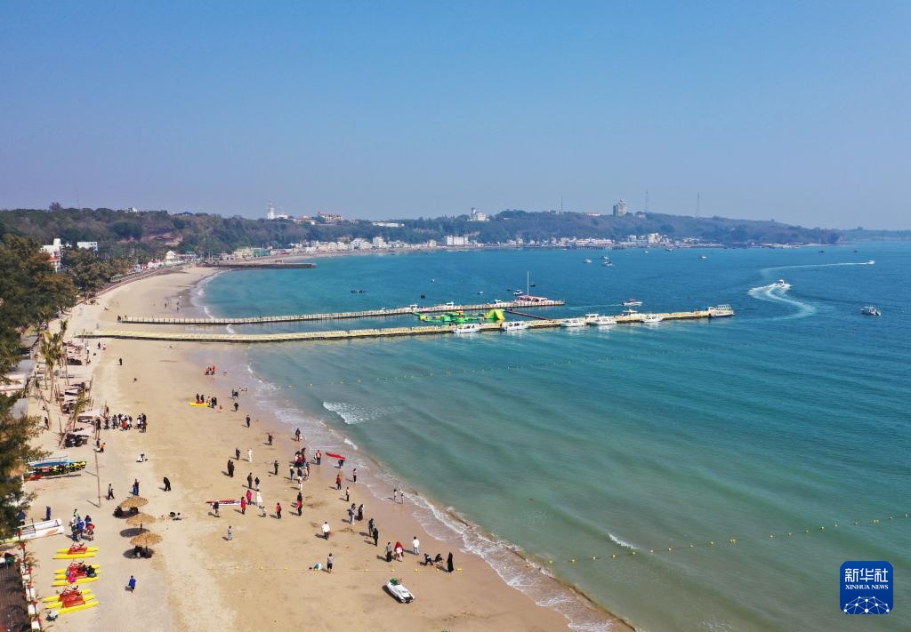 游客在广西涠洲岛的南湾海洋运动公园游玩(1月18日摄,无人机照片)。